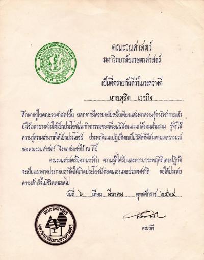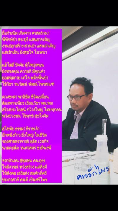 ขอบคุณเพื่อน วน.43(KU.37) ทั้งคนเรียนไพร:รศ.ดร.วศิน อิงคพัฒนากุล และนายมักเลาะ:คุณวิสูตร อยู่คง ที่เขียนกลอนให้กับความภูมิใจในรางวัลที่ได้รับในปีนี้ที่เกษียณอายุพอดี จากสมาคมศิษย์เก่าวนศาสตร์ หลังจากเมื่อ 38 ปีที่แล้ว ก็ได้รับรางวัลในคราวสำเร็จการศึกษาจากคณะวนศาสตร์ ทั้งขอตั้งปณิธานว่าจะทำเพื่อป่าไม้ต่อไป..