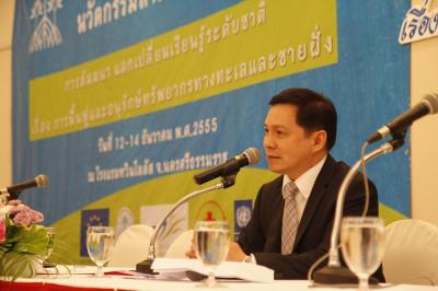 การสัมมนาแลกเปลี่ยนเรียนรู้ระดับชาติ เรื่อง การฟื้นฟูและอนุรักษ์ทรัพยากรทางทะเลและชายฝั่ง ภายในคำขวัญ ชุมชนชายฝั่ง รวมพลังฟื้นป่า นวัตกรรมล้ำค่า ฝ่าวิกฤตโลกร้อน ได้จัดขึ้นโดยมีวัตถุประสงค์สำคัญ 2 ประการ คือ 1) เพื่อนำเสนอองค์ความรู้และภูมิปัญญาในการฟื้นฟู อนุรักษ์ทรัพยากรทะเลและชายฝั่งและการตั้งรับปรับตัวของชุมชนชายฝั่งท่ามกลางการเปลี่ยนแปลงสภาพภูมิอากาศ และ 2) เพื่อสนับสนุน ส่งเสริมเครือข่ายความร่วมมือของหน่วยงานภาครัฐและประชาชนในการจัดการและอนุรักษ์ทรัพยากรทางทะเลและชายฝั่ง การตั้งรับปรับตัวของชุมชนชายฝั่งท่ามกลางการเปลี่ยนแปลงสภาพภูมิอากาศ โดยมีกำหนดการ 3 วัน ในวันที่ 12 ธันวาคม 2555 เป็นการศึกษาดูงานการจัดการและอนุรักษ์ทรัพยากรทางทะเลและชายฝั่งและการตั้งรับปรับตัวชุมชนชายฝั่ง ท่ามกลางการเปลี่ยนแปลงสภาพภูมิอากาศอย่างเป็นรูปธรรมขององค์กรชุมชน ในท้องที่อำเภอท่าศาลา จังหวัดนครศรีธรรมราช และในวันที่ 13 -14 ธันวาคม 2555 เป็นการจัดเวทีสัมมนาแลกเปลี่ยนความรู้และประสบการณ์ รวมทั้งการแสดงนิทรรศการและการนำเสนอผลงานในรูปแบบโปสเตอร์ของภาคีและหน่วยงานที่เกี่ยวข้อง โดยมี 4 องค์กร ที่สนับสนุนงบประมาณ คือ โครงการป่าชายเลนเพื่ออนาคต (Mangroves for the Future : MFF) โครงการเพิ่มศักยภาพการปรับตัวของชุมชนชายฝั่งที่เสี่ยงต่อการเปลี่ยนแปลงสภาพภูมิอากาศ (Increasing Coastal Community Capacity for Climate Change Adaptation : INCA) โครงการเสริมสร้างความสามารถในการรับมือกับผลกระทบของการเปลี่ยนแปลงสภาพภูมิอากาศในพื้นที่ชายฝั่งเอเชียตะวันออกเฉียงใต้ (Building Resilience to Climate Change Impacts in Southeast Asia Region : BCR และโครงการส่งเสริมชุมชนชายฝั่งเข้มแข็งปรับตัวต่อการเปลี่ยนแปลงภูมิอากาศในประเทศไทยและอินโดนีเซีย (Building Coastal Resilience to Reduce Climate Change Impact in Thailand and Indonesia Project : BCRCC) และมีองค์กรร่วมจัดที่เกี่ยวข้องอีก 15 องค์กร มีผู้เข้าร่วมสัมมนาจากหน่วยงานภาครัฐ ท้องถิ่น องค์กรเอกชน ภาคธุรกิจ และชุมชน จำนวน 222 คน