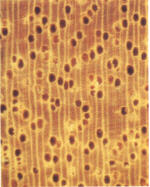 พอร์เป็นแบบพอร์เดี่ยว (solitary pore) พอร์แฝดมีน้อย แบบของการเรียงตัวไม่เด่นชัด การกระจายเป็นแบบกระจัดกระจาย (diffuse porous) มีสารตกค้าง (deposit) เป็นบางพอร์ พอร์ขนาดปานกลาง มีท่อยางต่อเรียงเป็นแนวยาวตัดกับเส้นเรย์ เส้นเรย์เห็นชัด พาเรงคิมาเป็นแบบพาเรงคิมาแบบปีก (aliform parenchyma) และพาเรงคิมาแบบปีกต่อ (confluent parenchyma)